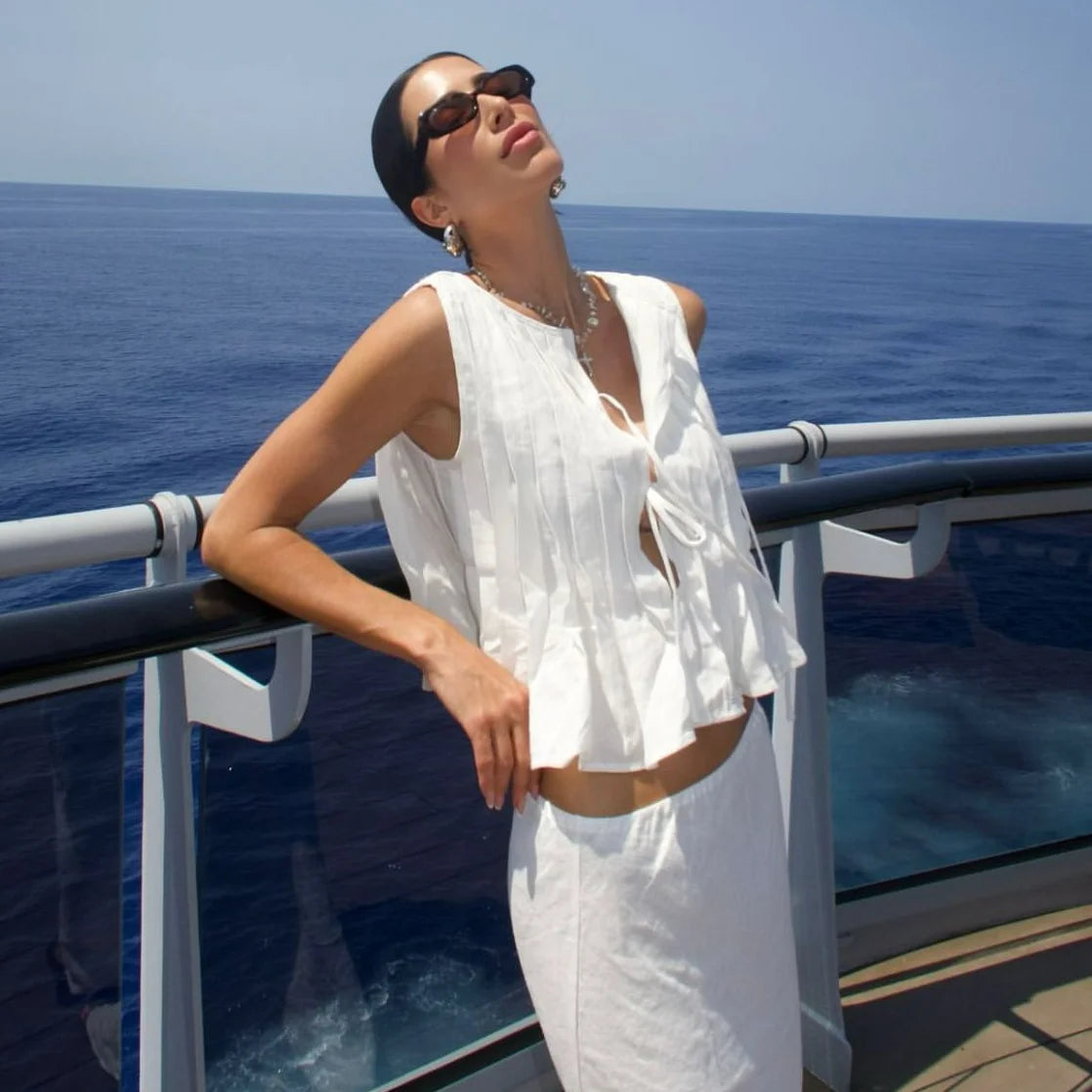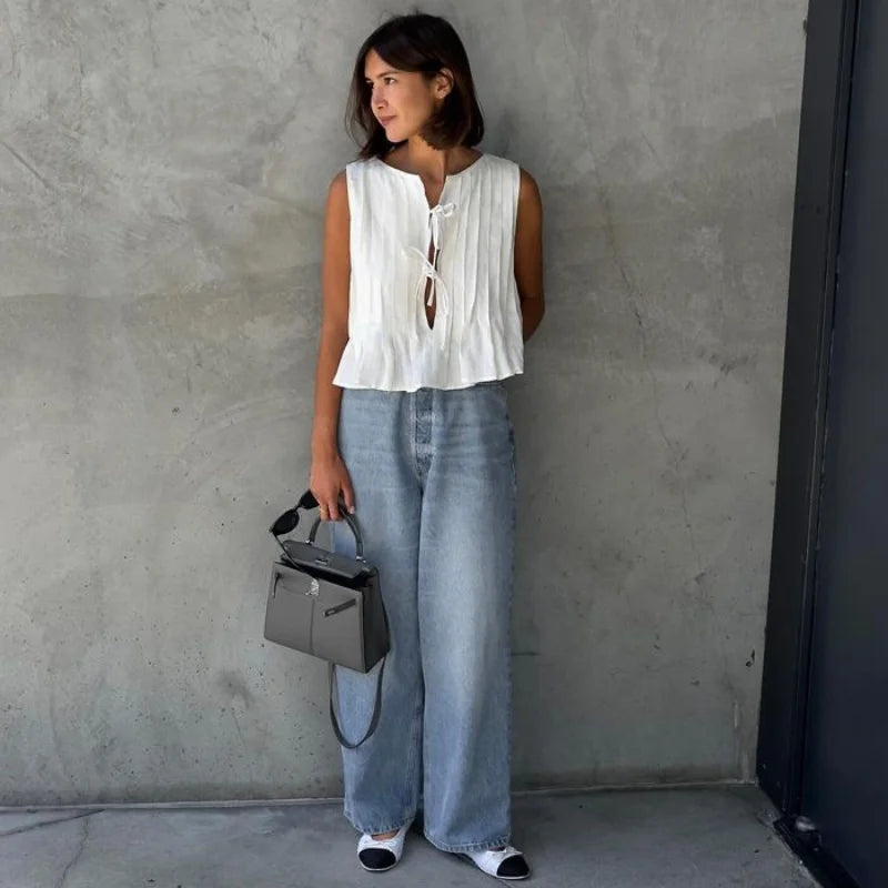Confectionné dans un mélange coton-lin respirant, ce haut sans manches présente des finitions plissées et un col rond discret. Le laçage fin sur le devant ajoute une touche féminine. Son tissu doux et léger offre un drapé aérien et un entretien facile pour une durabilité saison après saison.