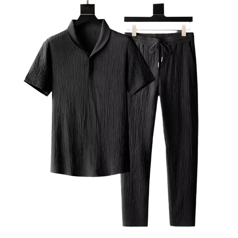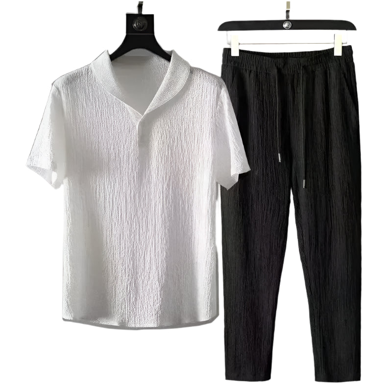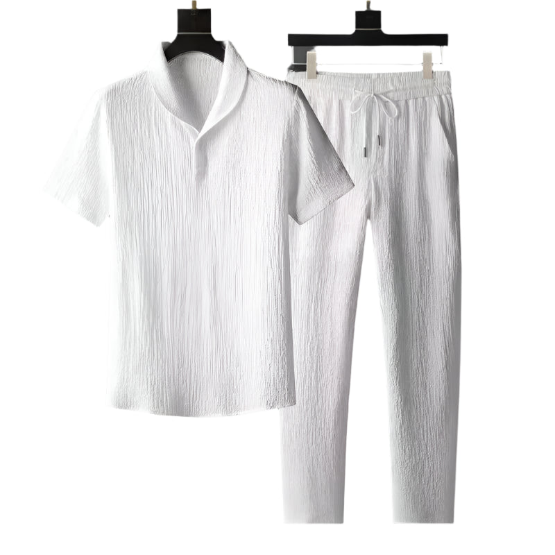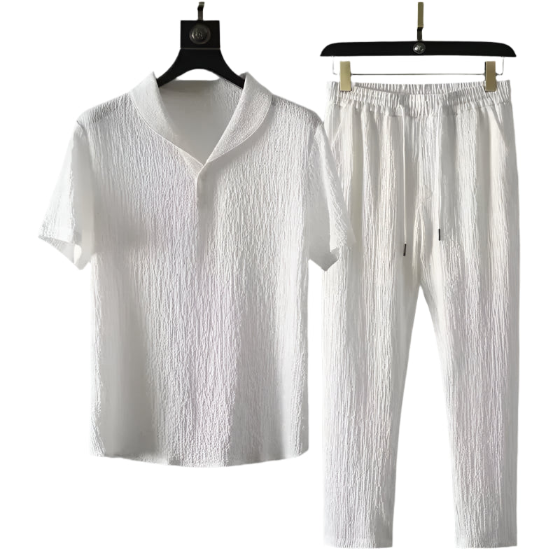 Ensemble comprenant une chemise à manches courtes avec col V décontracté/souple et un pantalon long avec taille élastique et cordon de serrage. Le tissu en coton-lin léger présente une texture naturelle et une coupe ample et fluide. Entretien facile.