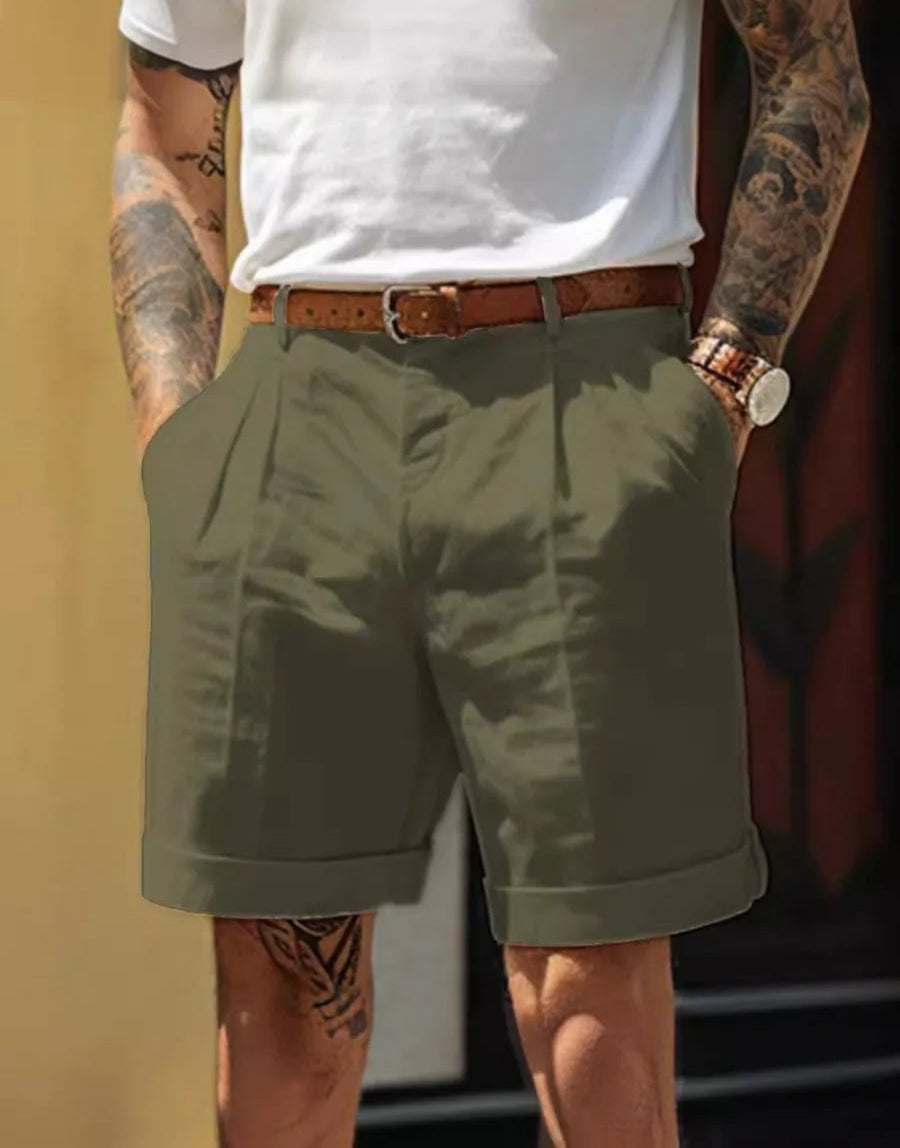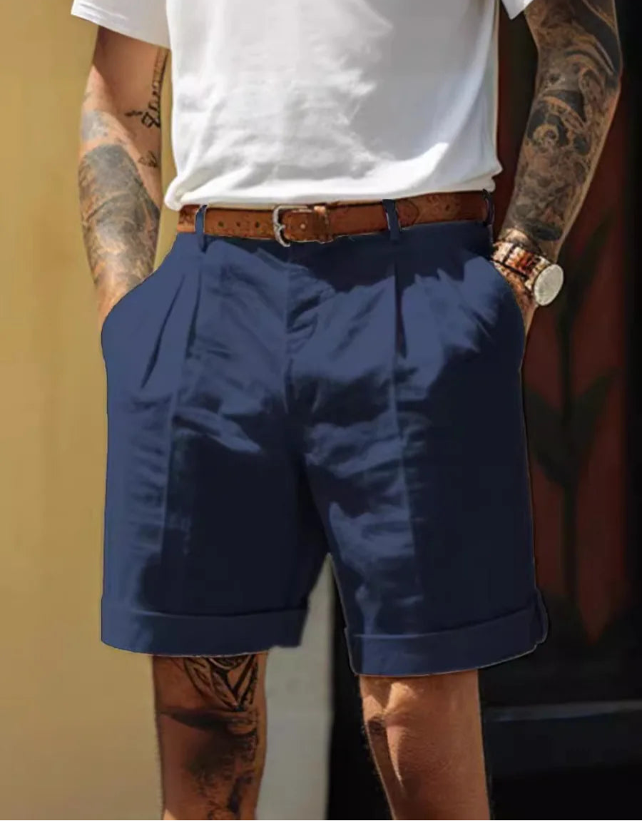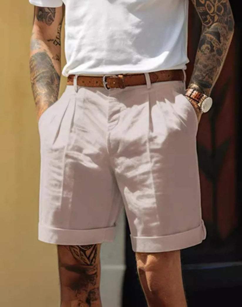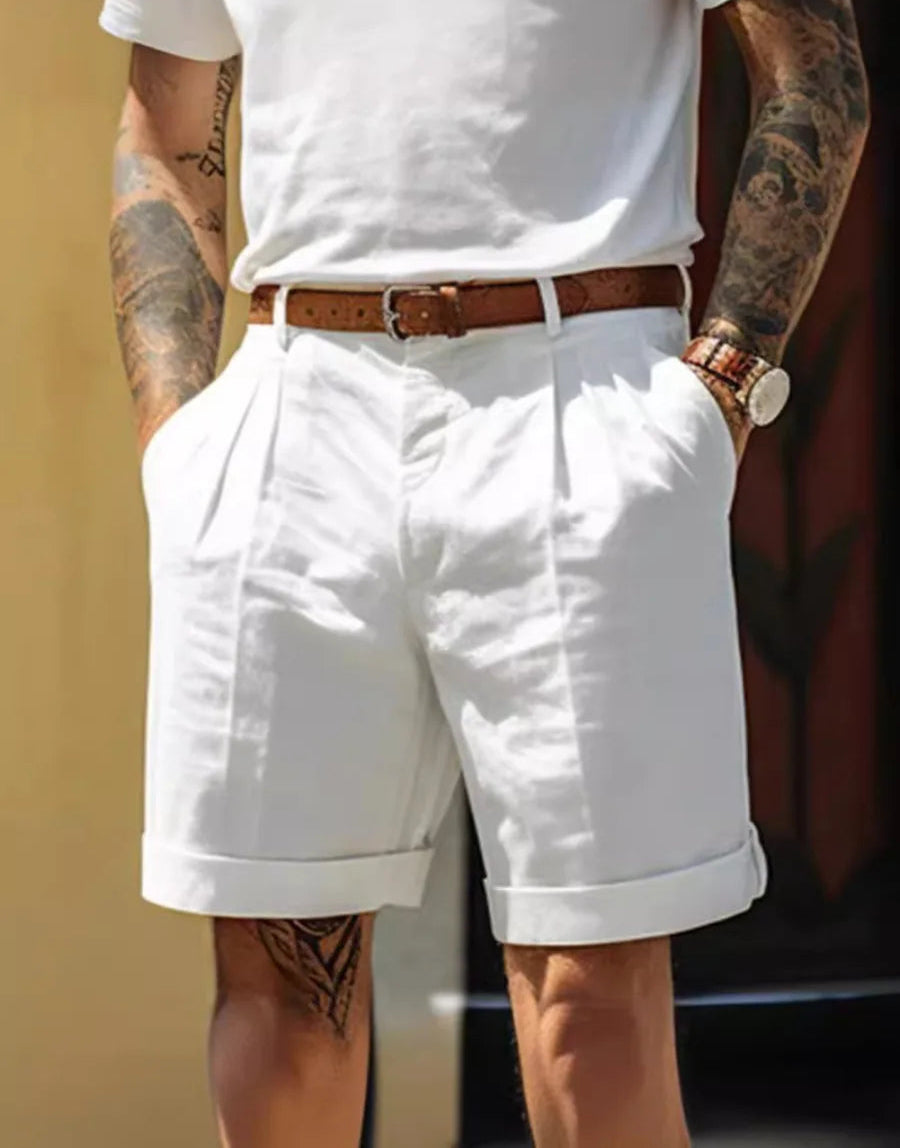 Fabriqué dans un mélange respirant de coton et lin, ce short mi-long présente des plis sur le devant, une coupe droite et un ourlet retroussé. Doté de poches latérales pratiques et d'une taille classique avec passants de ceinture, il combine fonctionnalité et style pour l'été.